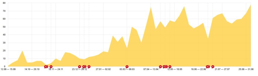 Мы начали работу с сайтом в начале августе 2024. Сразу провели seo-оптимизацию всего сайта. И уже со 3-ого месяца работы мы увидели устойчивый рост переходов из поисковой системы, который продолжает расти по сегодняшний день.